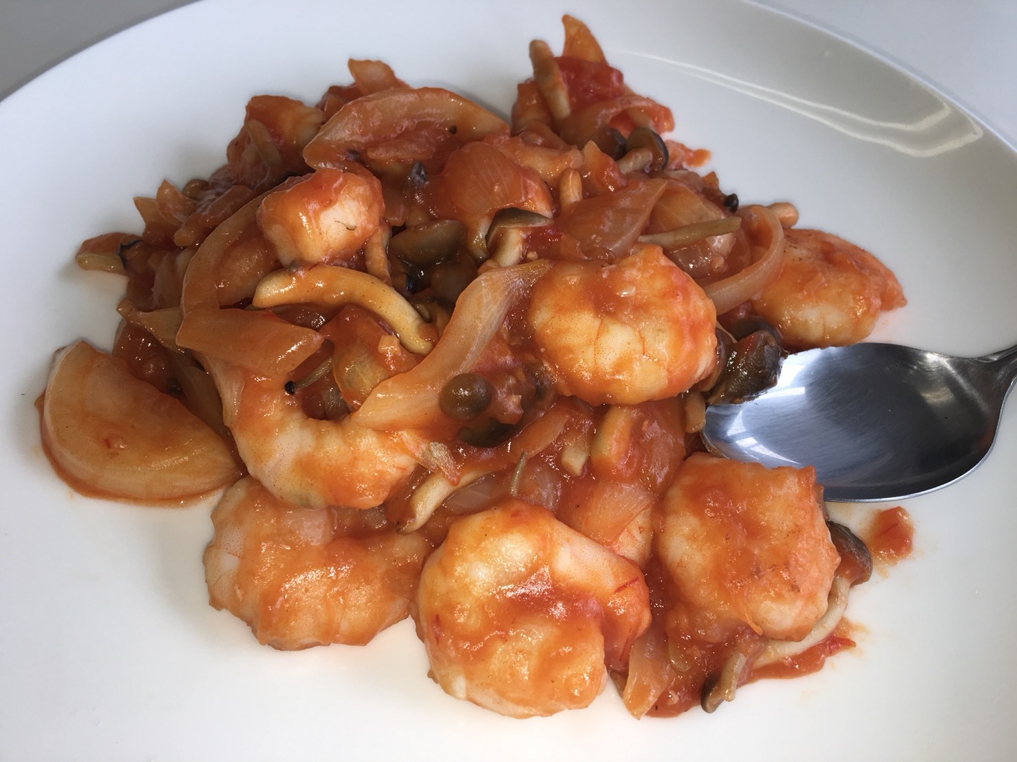 | ⑤フライパンに油を足し、にんにくを入れ香りがたったら、玉ねぎ・しめじを炒め、チリソースをいれよくまぜたら、えびを入れ味をなじませとろみがついたら完成。 |