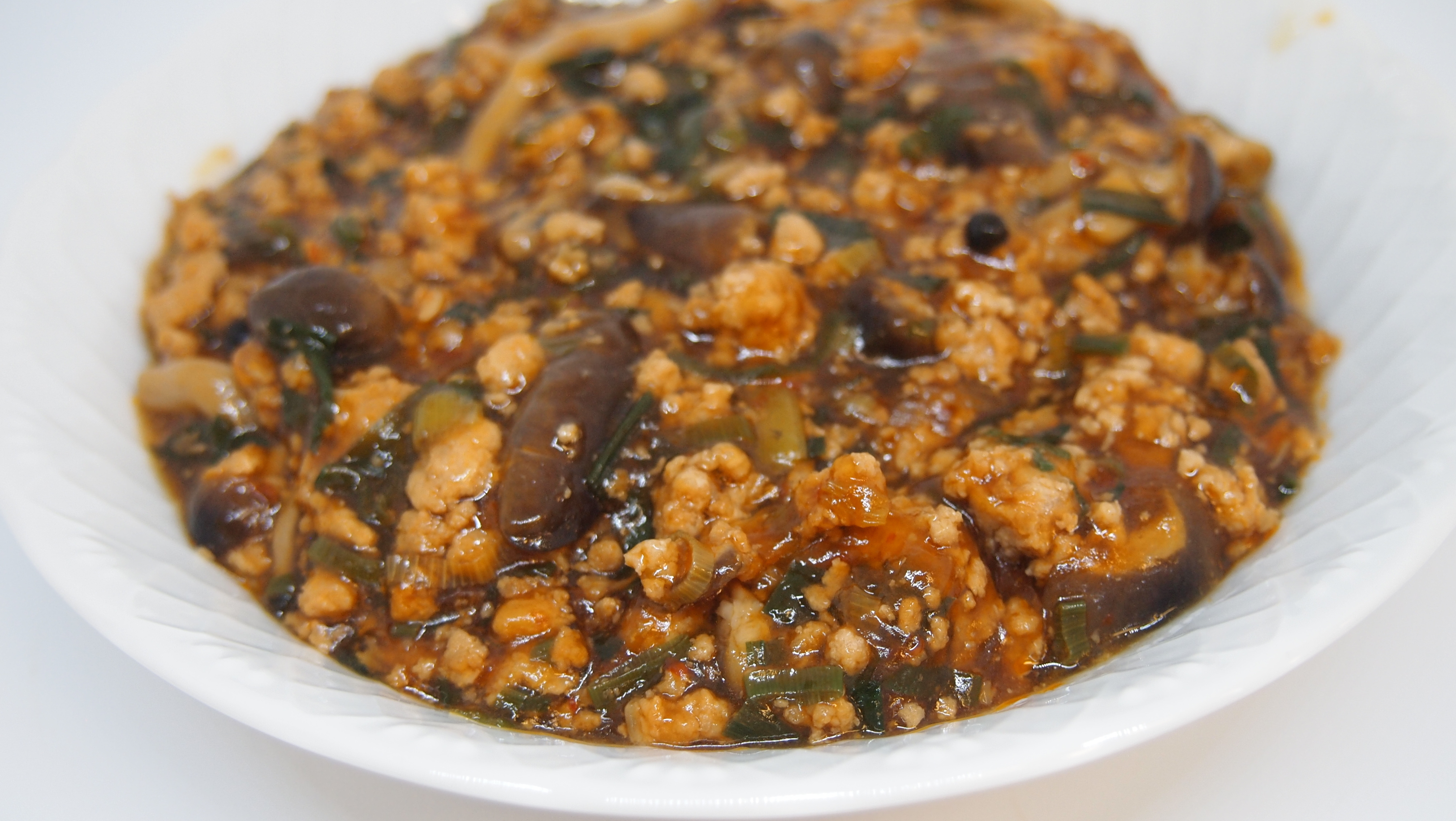 | ②フライパンにごま油小さじ1を強めの中火で熱し、ひき肉をほぐし過ぎないように炒める。 色が変わったらきのこを加えしんなりとしたらネギ・ニラを加える。 |